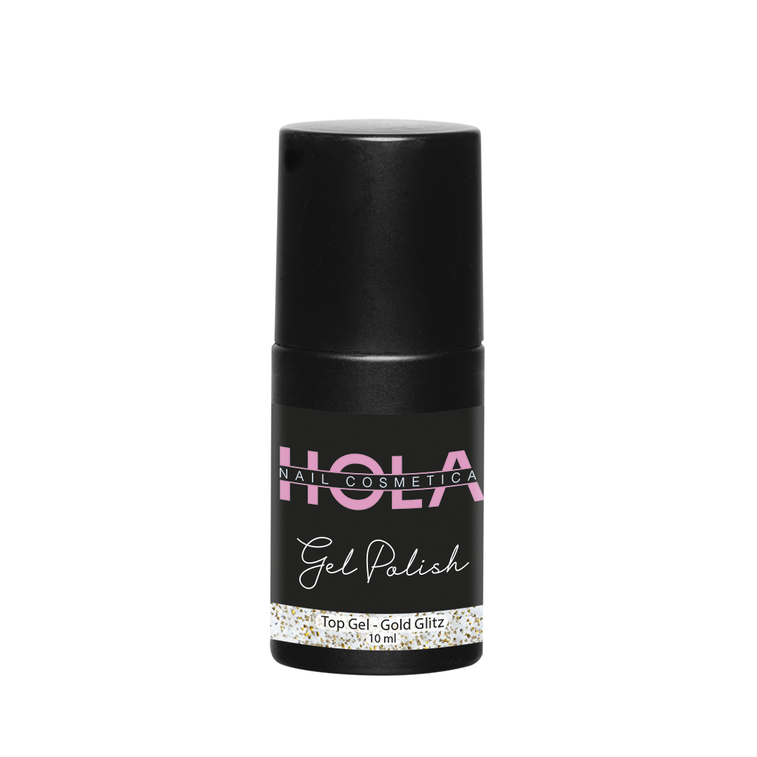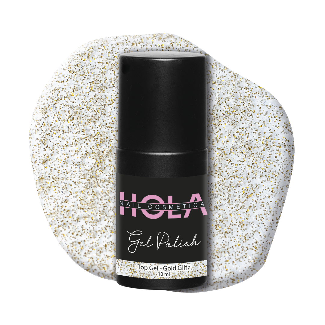 Met Hola Top Gel Gold & Silver Glitz geef je je gellak een hele nieuwe dimensie. Gebruik Hola Top Gel Gold & Silver Glitz naast je normale top gel om sommige, of juist alle kleuren op je nagels er extra uit te laten springen. Uitharding: 120 sec. UV / 30 sec. LED